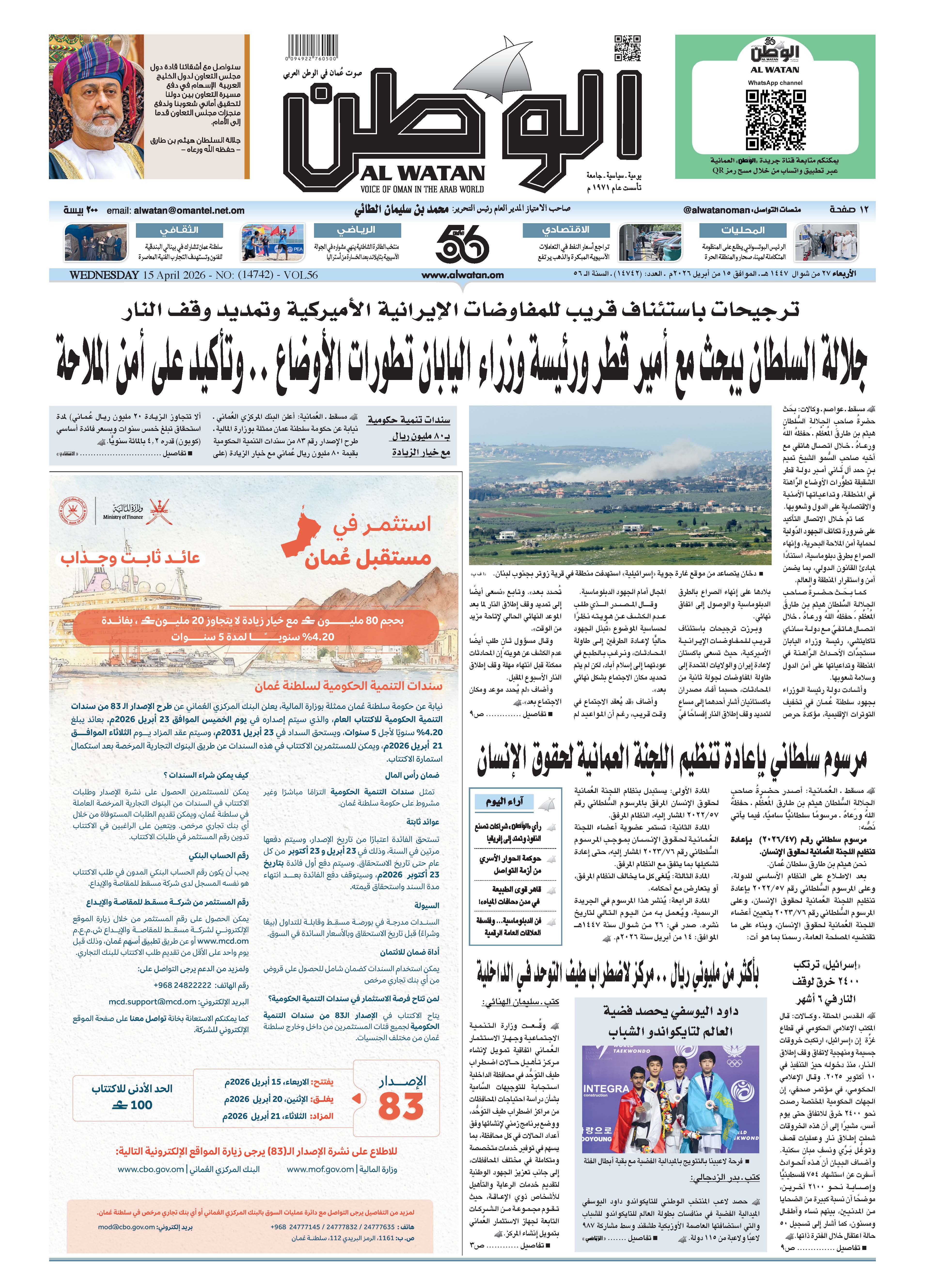 «الوطن» صحيفة يوميَّة سياسيَّة تَصدرُ أيام الأسبوع من الأحد إلى الخميس، وهي ذاتُ ملكيَّة فرديَّة.. صاحب الامتياز المدير العام ورئيس التحرير محمد بن سليمان بن محمد الطائي.